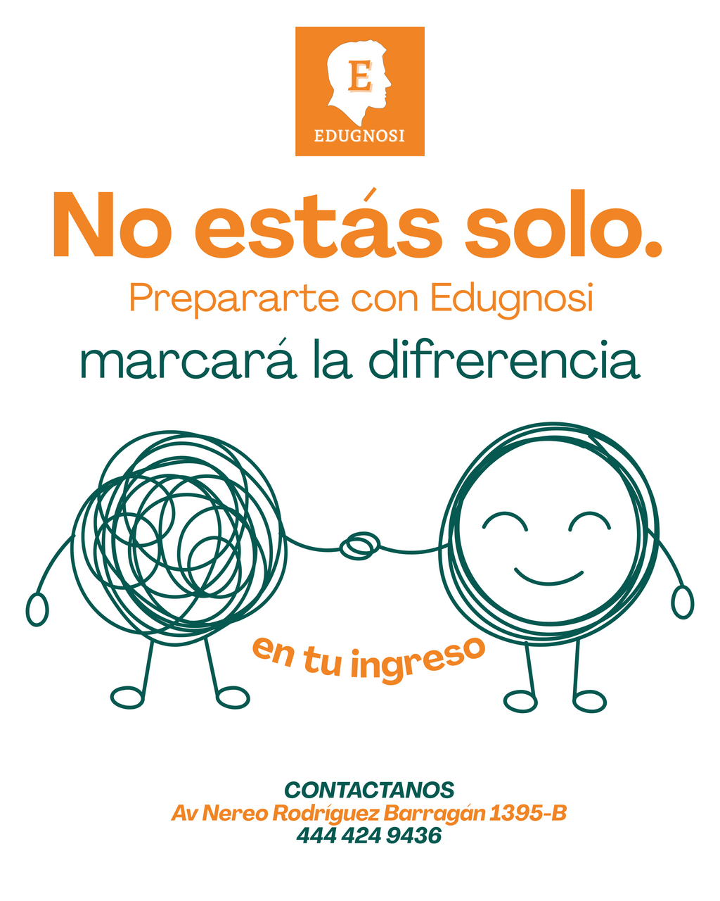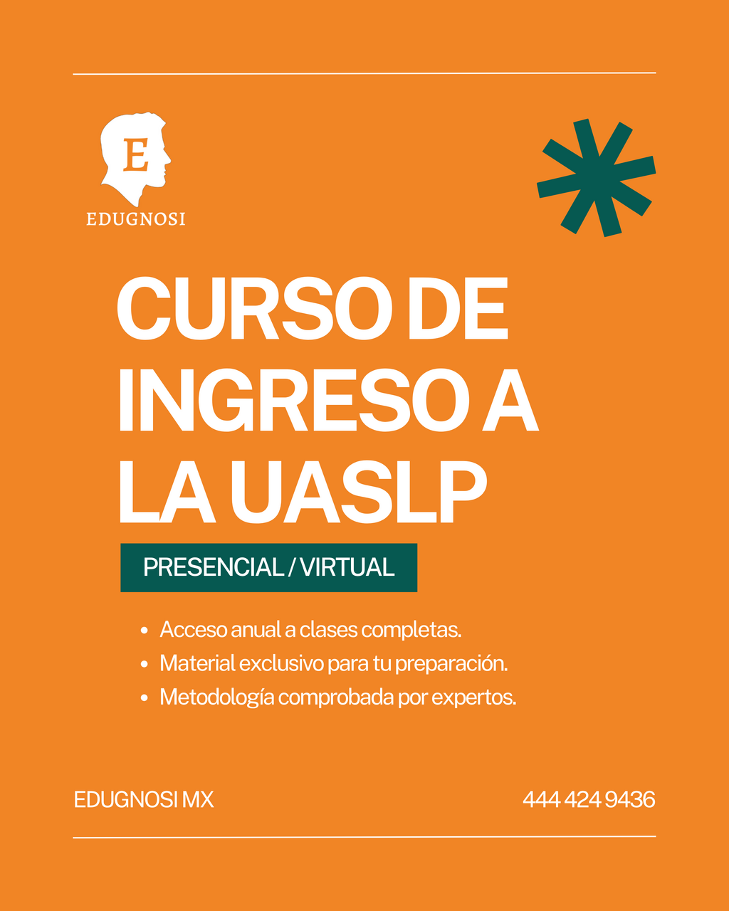 El Curso Semestral de Ingreso a la UASLP 2026 ofrece preparación 100% personalizada, con clases presenciales o en línea, docentes expertos, simulacros tipo UASLP, cuadernillos exclusivos, plataforma virtual, asesorías, talleres y acceso a EDUGNOSI GPT 24/7.